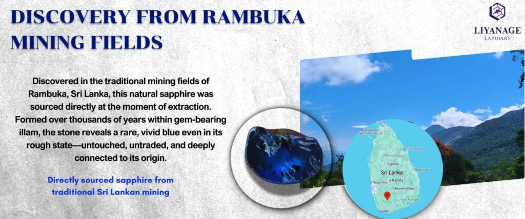 In the gemstone world, certain locations quietly build a reputation among professionals for producing stones with unique personality. One such place is the Rambuka village around mining in Sri Lanka, an area known among miners and dealers for yielding sapphires with distinctive tones and occasional flashes of unusually vivid blue. While many stones from this region show softer or slightly greenish blue hues, every now and then the earth reveals something special — a sapphire with a deeper, more intense color that immediately captures attention.