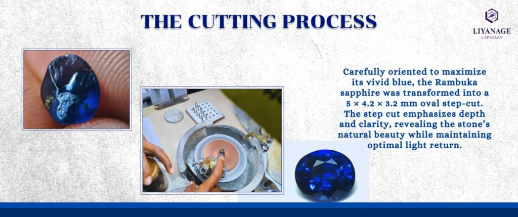 After shaping and faceting, the stone was transformed into a finished oval step-cut sapphire measuring 5 × 4.2 × 3.2 mm.