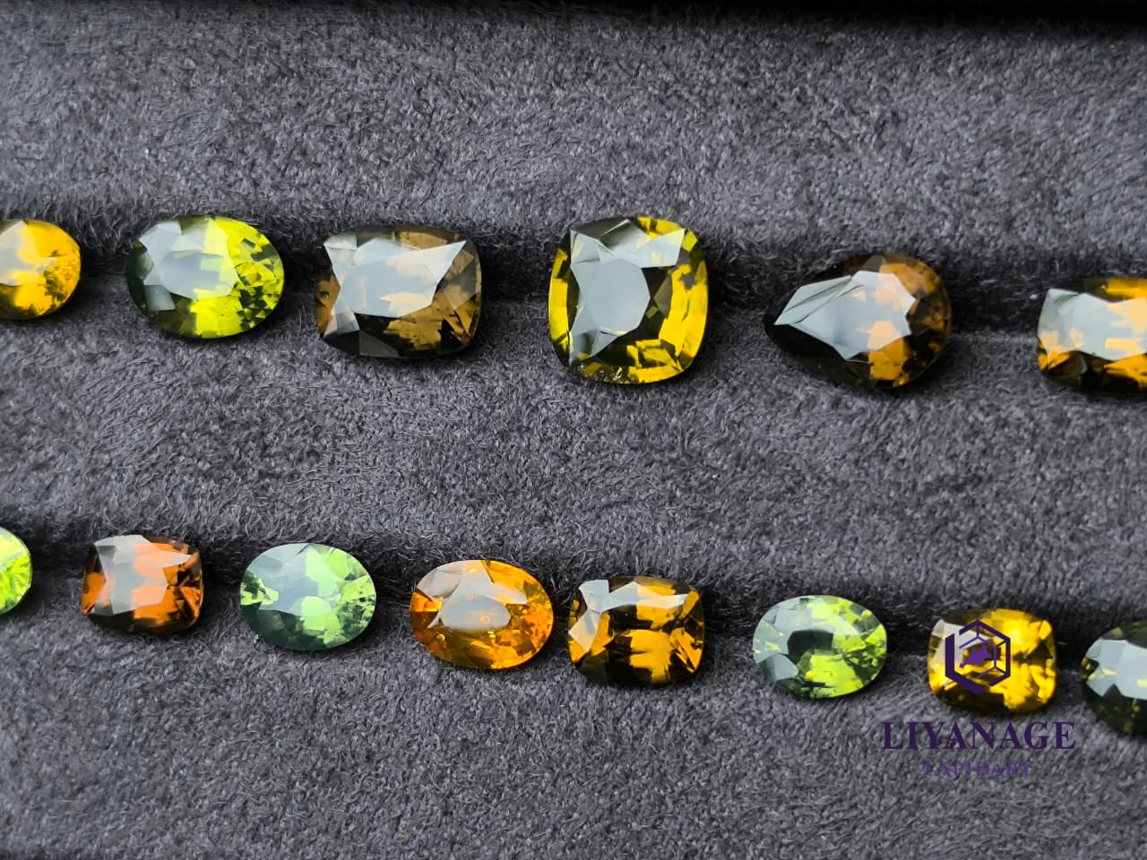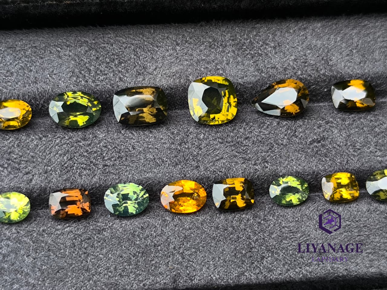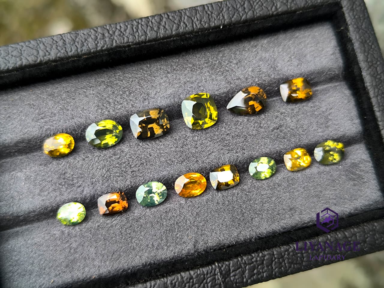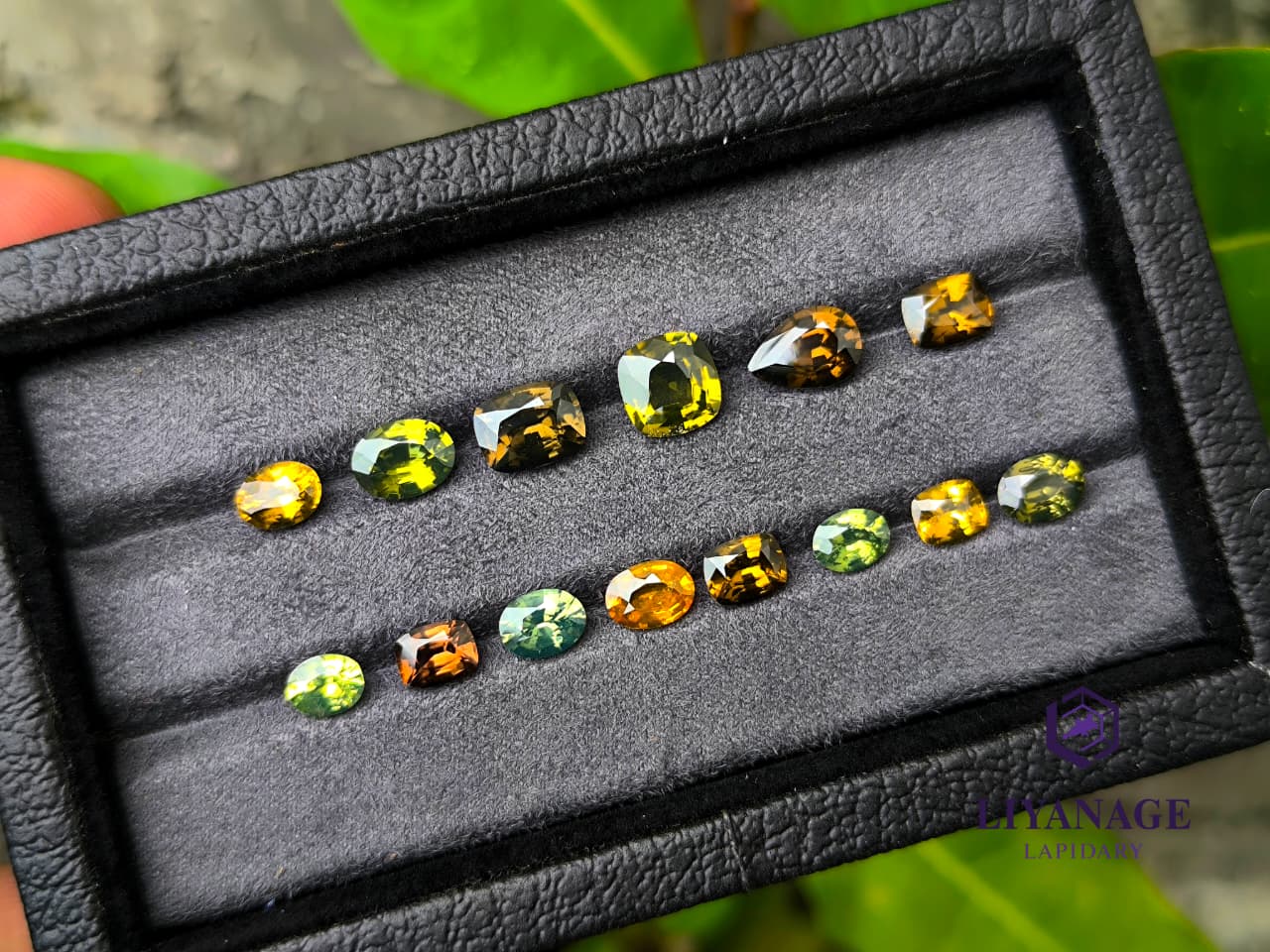 This is a collection of 14 pieces of Ceylon natural zircon in a mix of vibrant earthy tones, directly sourced from Rakwana village around mining in Sri Lanka. The total weight of the parcel is 21.58 carats, with individual stones ranging from 2.89 to 0.83 carats in weight. The color palette includes green, olive green, yellow, orange, and brown, offering a rich blend of natural hues. The shapes include oval, cushion, and pear cuts,  All stones are unheated